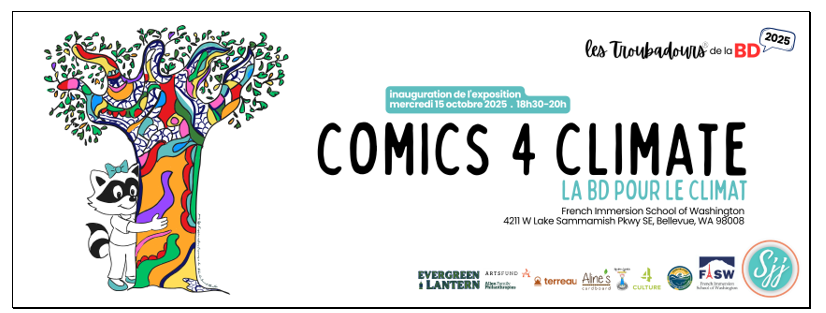 Les équipes de FISW et de Sjj agency ont le plaisir de vous inviter au lancement officiel de l’exposition COMICS 4 CLIMATE, ce mardi 15 octobre 2025 à partir de 18h30 à la French Immersion School of Washington (FISW).