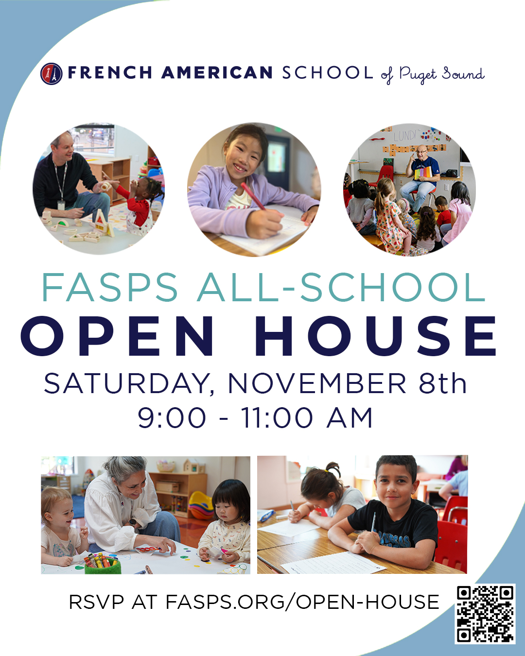 Venez découvrir le programme bilingue de l’école Franco-Américaine du Puget Sound à la prochaine matinée portes ouvertes sur notre campus de Mercer Island :